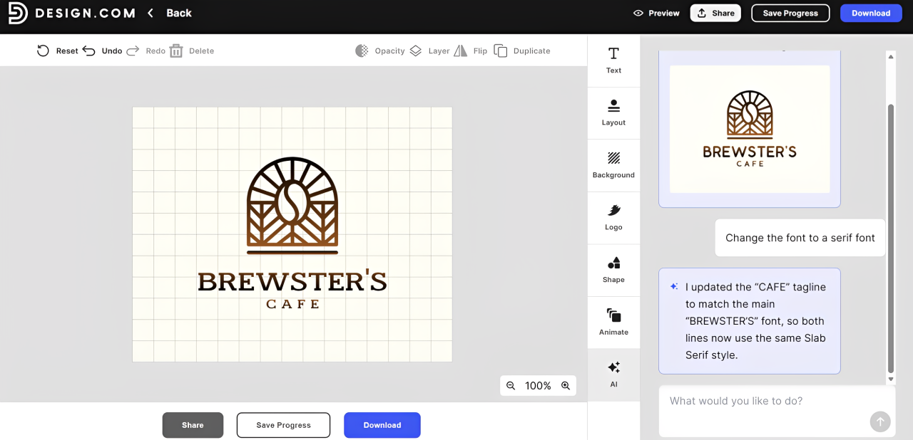 - Advanced AI logo editing – Edit both your logo icon and text using AI, request changes through a simple chat interface, and get copyright-safe edits powered by Design.com’s custom-trained model.